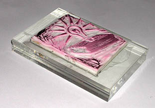 5. Index the mount. Ink the die on a good black stamp pad, place it ink side up on your work surface, and press the mount down on it. Be sure that the ink will adhere to the mount. Unless you can find special solvent-based ink for hard surfaces, use unfinished wood mounts. To get the image positioned accurately on the mount, put the mount down on a piece of paper and trace its outline with a pencil; position the inked die in the right place within the outline; and use the outline to guide you as you press the mount down on the die.